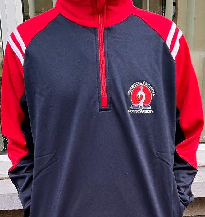 The school half zip can be purchased in Cash’s Clonakilty. The pupils may wear a generic red polo t-shirt and plain navy tracksuit pants. Plain navy shorts may be purchased in Cash’s for the warmer weather.